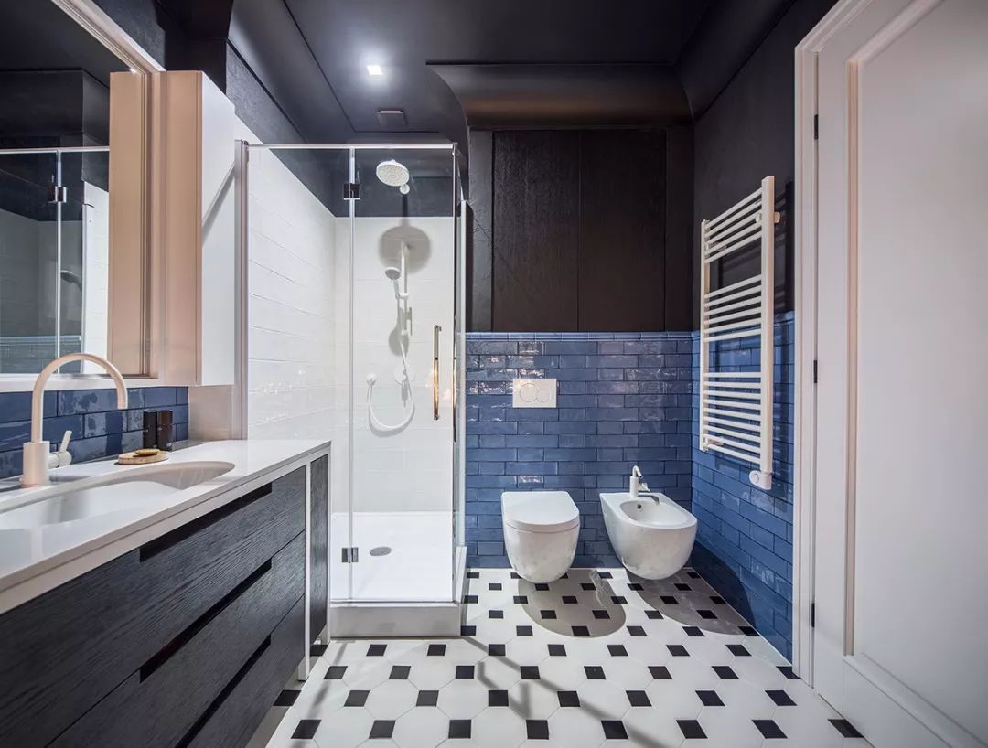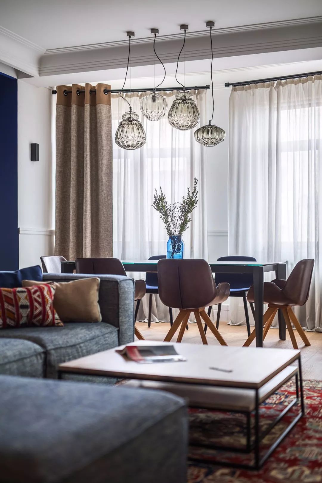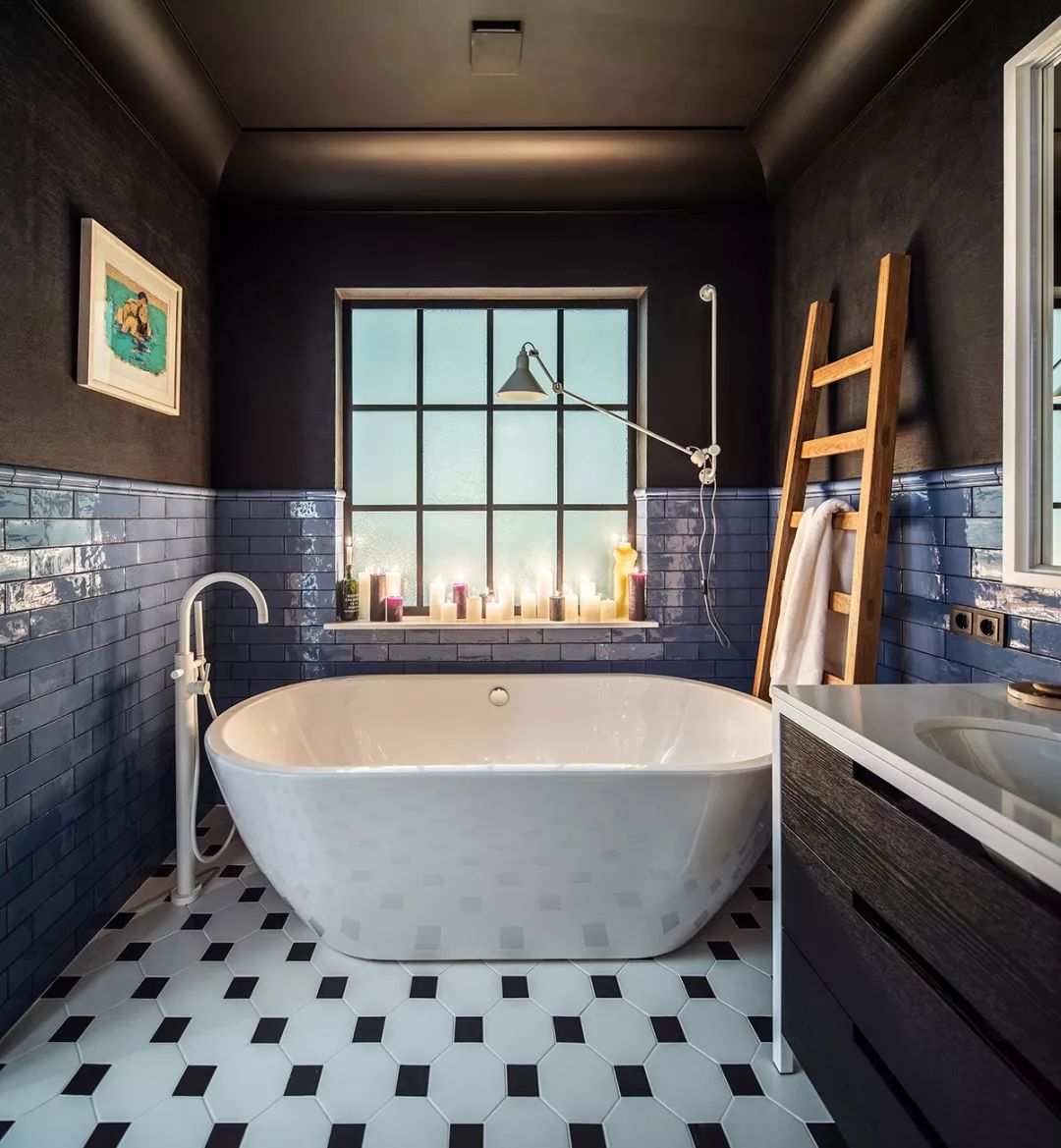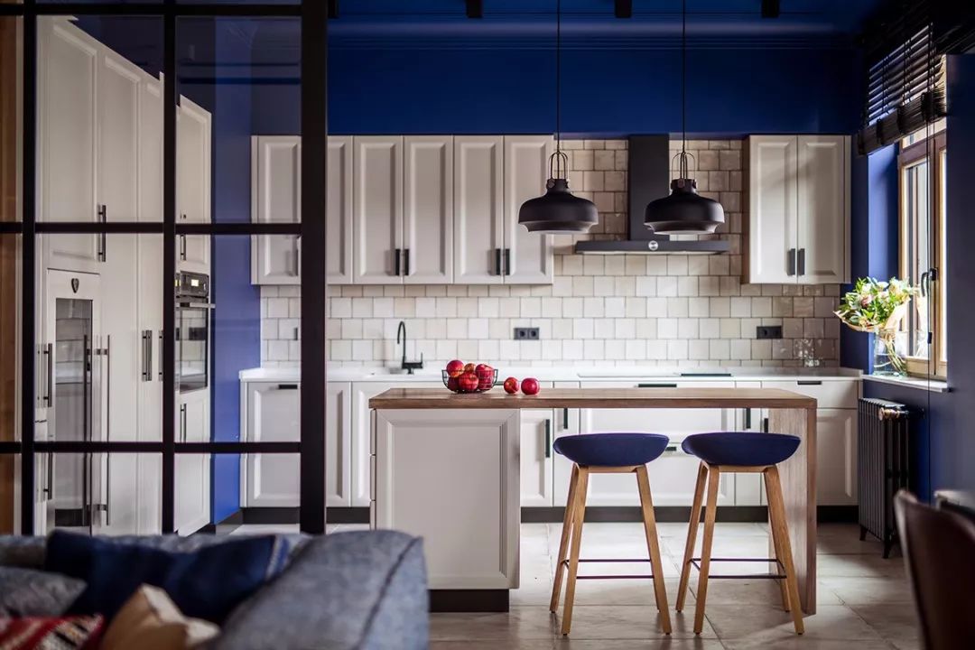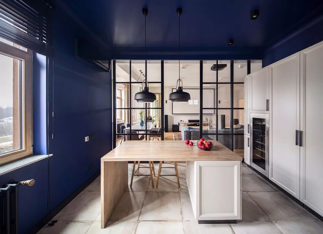 复古风格为塑造其怀旧氛围,用色较偏灰浊,常使用色彩原色,并调整其彩度来表现,像是此案中设计师用沉稳色调的蓝串连整体居家。